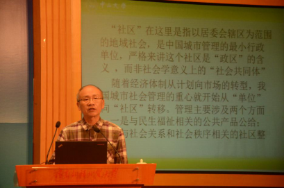 论坛的第三个阶段为“社会组织创新发展与社区治理”报告会。中山大学的蔡禾教授就社区异质性与社区治理发表了精彩的讲话。蔡禾教授以城市社会学为例,主张市场社会的流动改变了城市人的流动性,并巧妙运用了同一栋楼中上下邻居差异的例子说明了对不同的社区管理应该是不同的,强调了社区差异会影响社区关系。