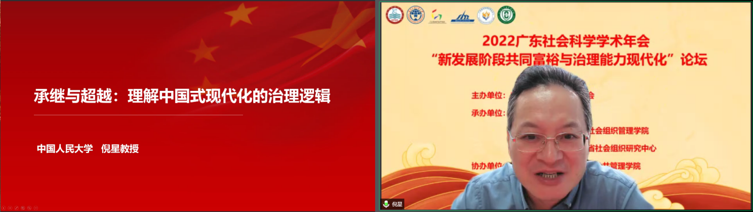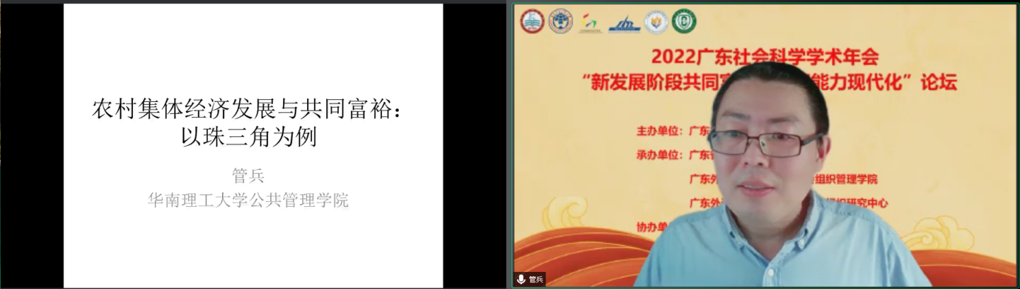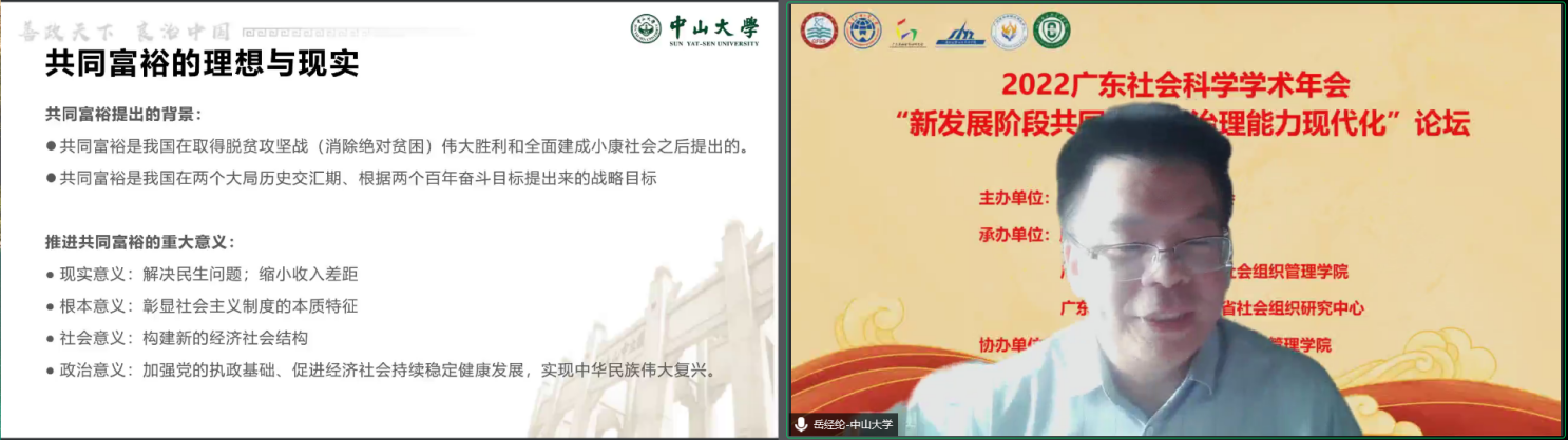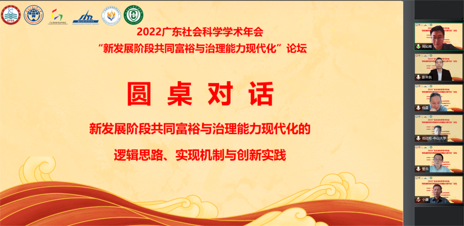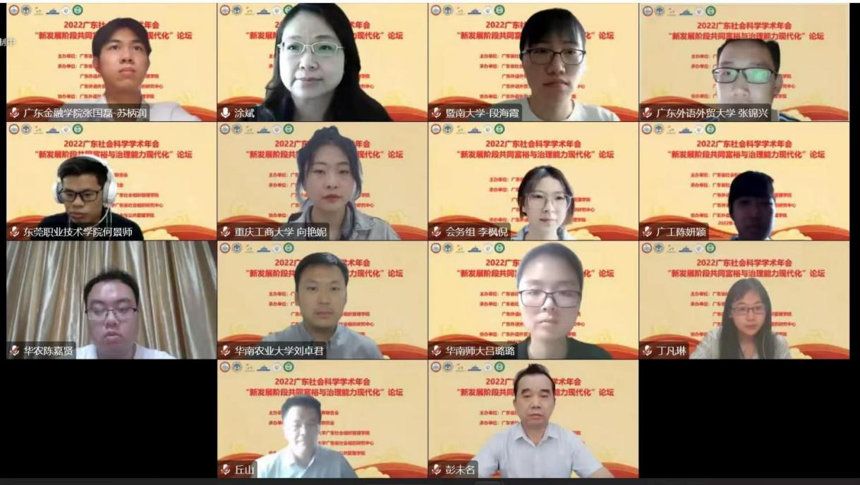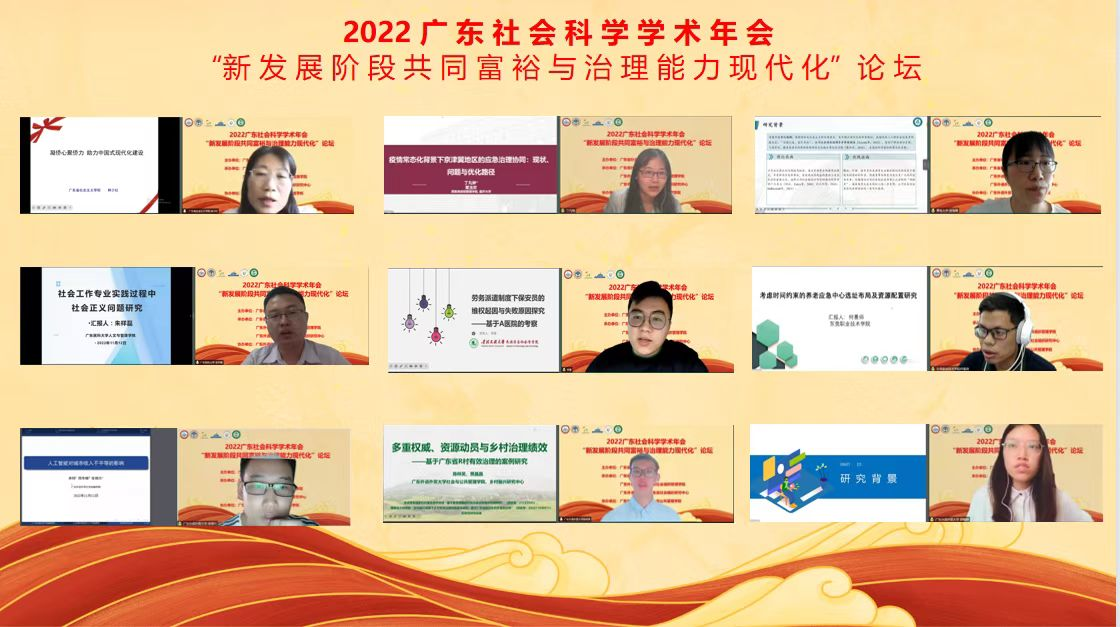 为深入宣传贯彻党的二十大精神,学习领会习近平总书记关于共同富裕与治理能力现代化的重要论述精神。11月12日,由广东省社会科学界联合会主办,广东省社会管理研究会、广东外语外贸大学广东社会组织管理学院和广东省社会组织研究中心承办,广东外语外贸大学社会与公共管理学院协办的2022广东社会科学学术年会“新发展阶段共同富裕与治理能力现代化”论坛通过线上方式举行,来自省内外专家学者250余人参加会议。